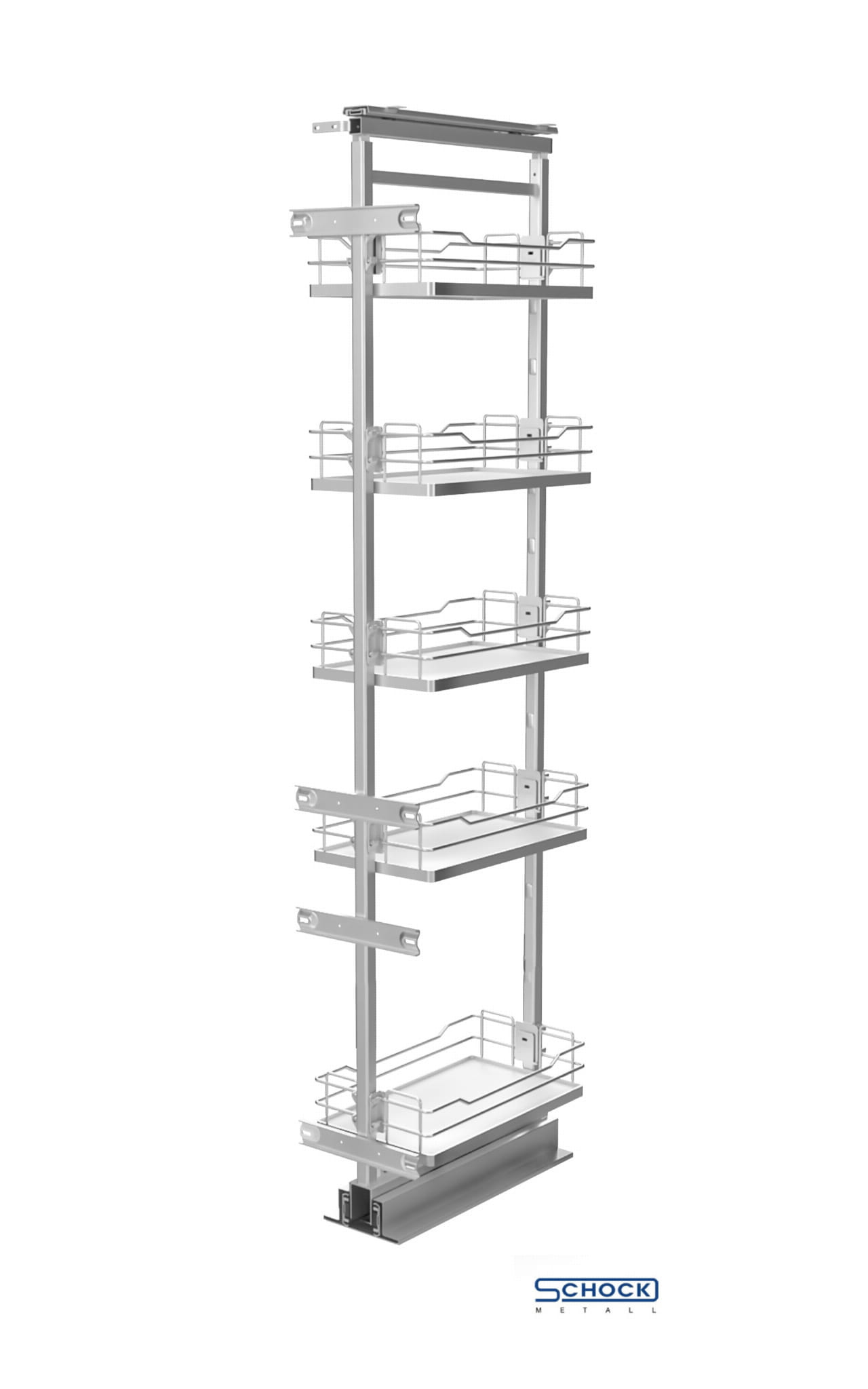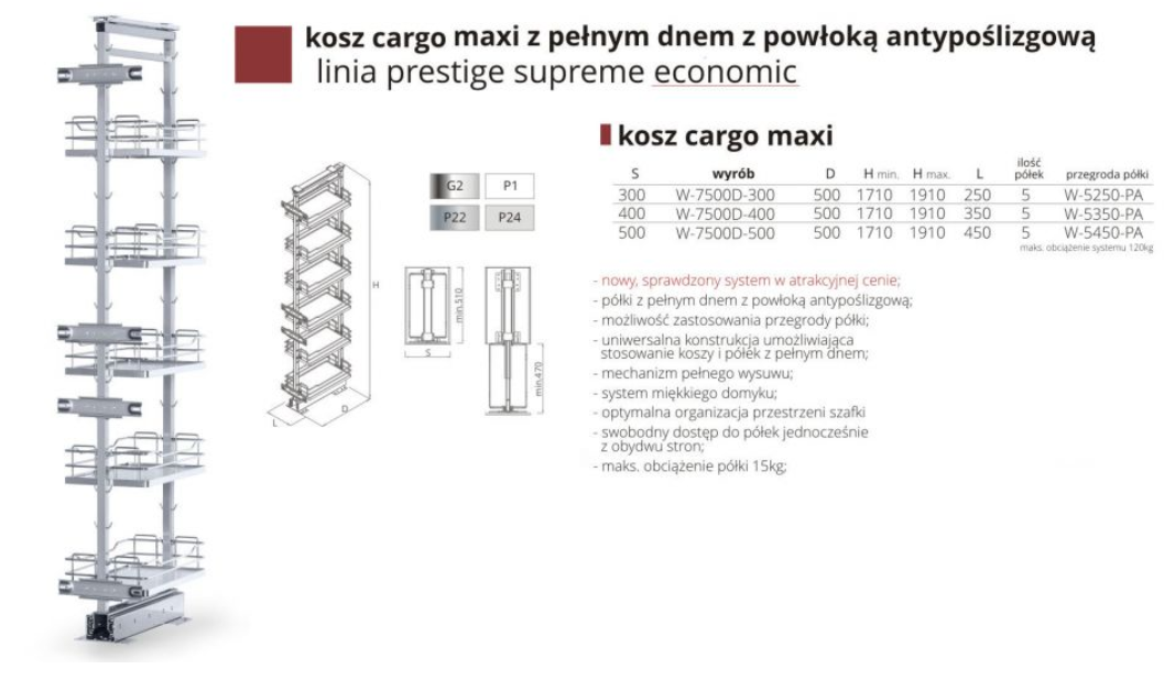 Kosz Cargo Supreme Maxi 30.5 Chrom to sprawdzony system z powłoką antypoślizgową na dnie półek, który pozwala na optymalne wykorzystanie dostępnej przestrzeni. Dzięki mechanizmowi z prowadnicami pełnego wysuwu, dostęp do szafki jest możliwy z dwóch stron, co ułatwia znacznie wykonywanie codziennych czynności. Zastosowanie miękkiego domyku sprawia, że kosz ten działa prawie bezgłośnie. Ponadto odpowiednia konstrukcja umożliwiła zamontowanie pięciu półek z pełnym dnem, które można przegrodzić. Solidne kosze Cargo Supreme Maxi 30.5 Chrom utrzymają łącznie, maksymalnie 120 kg i sprawdzą się przede wszystkim w wysokich szafkach o szerokości 30 cm. Zostały wykonane w chromowanym, uniwersalnym kolorze.