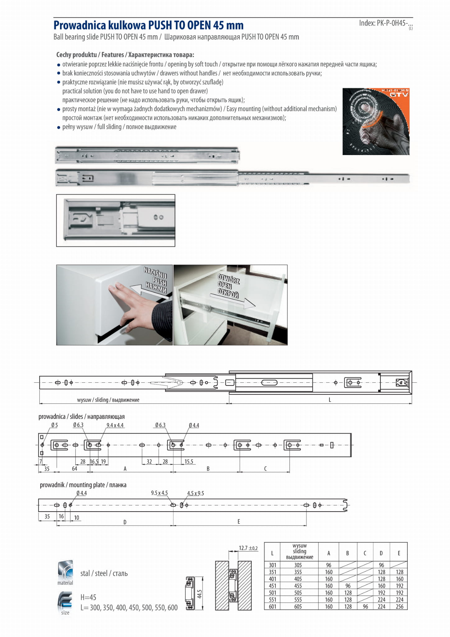Prowadnica Push to open GTV to innowacyjne rozwiązanie wśród podstawowych akcesoriów meblarskich. Po zamontowaniu produkt umożliwia otwieranie szuflad i szafek bez konieczności używania rąk i siły, bowiem wykorzystana w nim została specjalna technologia. Otwieranie poszczególnych elementów mebli następuje poprzez lekkie naciśnięcie frontu drzwi. Dodatkowo, prowadnica o długości 300 mm zwalnia z obowiązku montowania uchwytów na frontach szafek, a przymocowanie jej nie wymaga zakładania dodatkowych mechanizmów. Komfort późniejszego użytkowania jest bardzo wysoki, a wynika to choćby z pełnego wysuwu. Prowadnica Push to open GTV jest rozwiązaniem, które sprawia, że nawet prozaiczne korzystanie z szuflad może okazać się jeszcze bardziej komfortowe.
