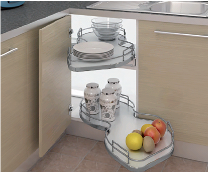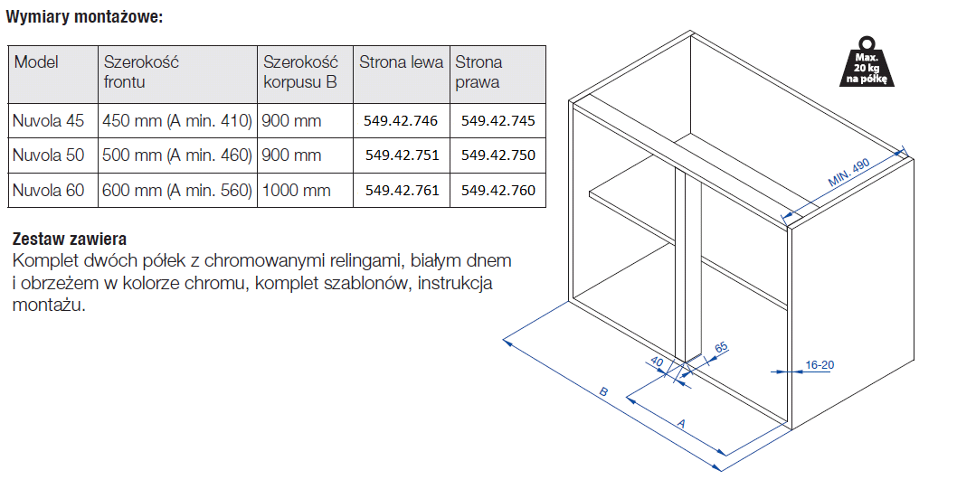 PÓŁKA NUVOLA 600 B/CHR PRAWA to ergonomiczny mebel zwiększający możliwości przechowywania produktów i narzędzi w szafkach. Zastosowanie mechanizmu obrotowego półki, w sposób maksymalny umożliwia wykorzystanie przestrzeni w szafkach, a w szczególności w tych narożnych. Przystosowane są one do szafek o głębokości 490 mm oraz do obciążenia 20 kg, więc idealnie sprawdzą się do przechowywania drobnych sprzętów AGD oraz produktów spożywczych. Szafka jest również w całości wysuwana, co pozwala na szybki i niezwykle wygodny dostęp do najbardziej potrzebnych artykułów. PÓŁKA NUVOLA 600 B/CHR PRAWA posiada ograniczniki w kolorze chromu, a w komplecie znajdują się dwie półki do zamontowania.